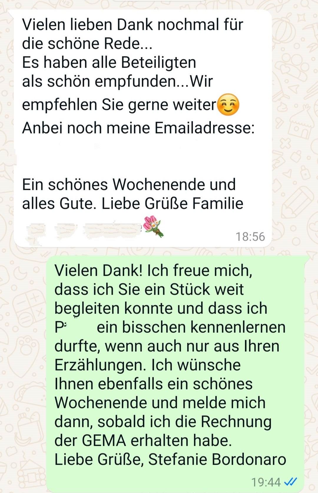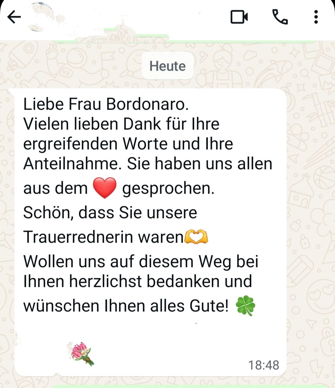 Auch wenn Sie keine christliche Ausgestaltung der Trauerfeier wünschen, sondern eine individuelle Rede, die das Leben und die Besonderheiten des Verstorbenen in den Vordergrund stellt, die liebevolle und dankbare Erinnerung weckt, Ihnen in der schwierigen Zeit Trost spendet und vielleicht auch einmal über die ein oder andere Erinnerung schmunzeln lässt, bin ich Ihre passende Ansprechpartnerin. Wir gestalten die Trauerfeier gemeinsam mit Liedern, einer individuellen und schönen Rede und passenden Abschiedsworten am Grab, sofern Sie dies wünschen.