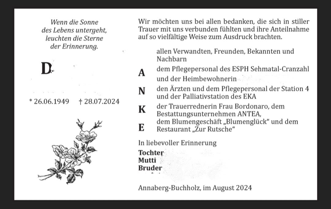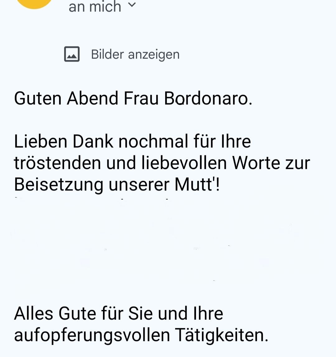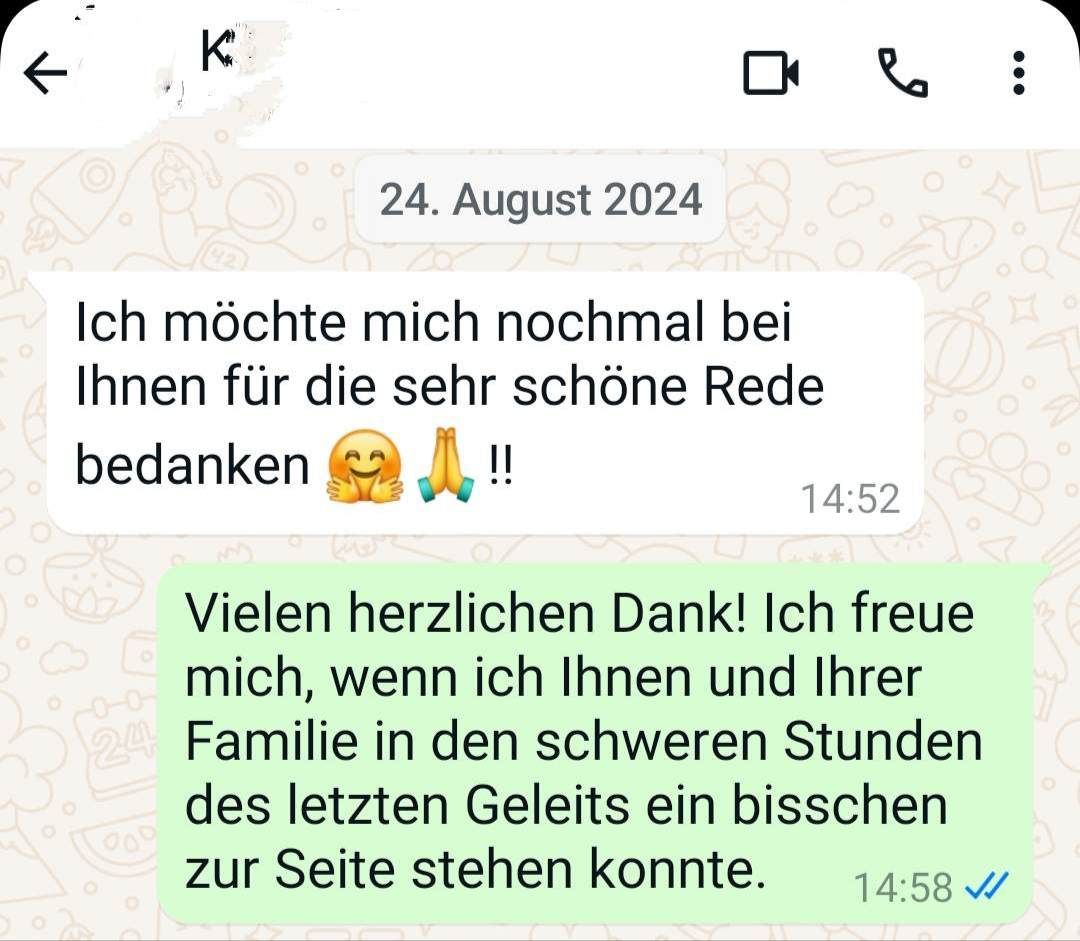 Nichts ist schwieriger, als einen geliebten Menschen verabschieden zu müssen. Gerade in den Momenten, wo man den Tod des Angehörigen noch gar nicht fassen kann, sich taub vor Schmerz und handlungsunfähig fühlt, ist es wichtig jemanden zu finden, dem man vertrauen kann. Ich helfe Ihnen gerne einen feierlichen und würdevollen Rahmen für das letzte Geleit Ihres lieben Angehörigen zu schaffen und das zu einem fairen Preis.